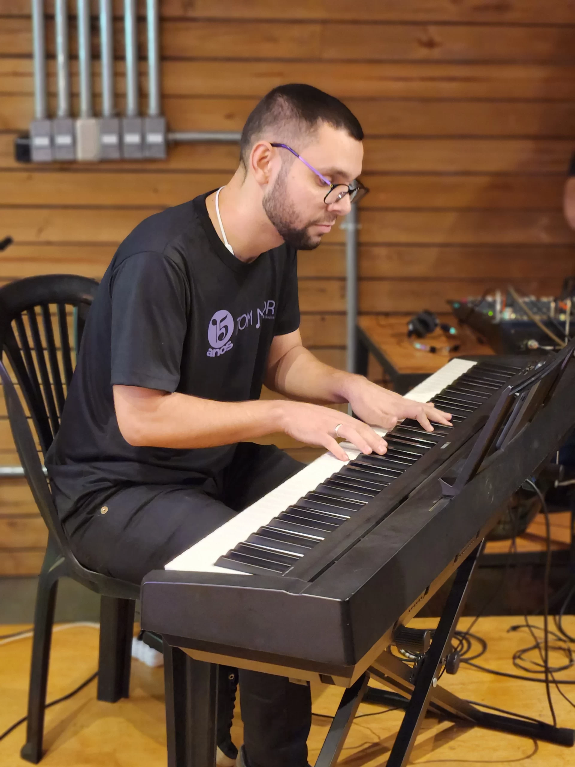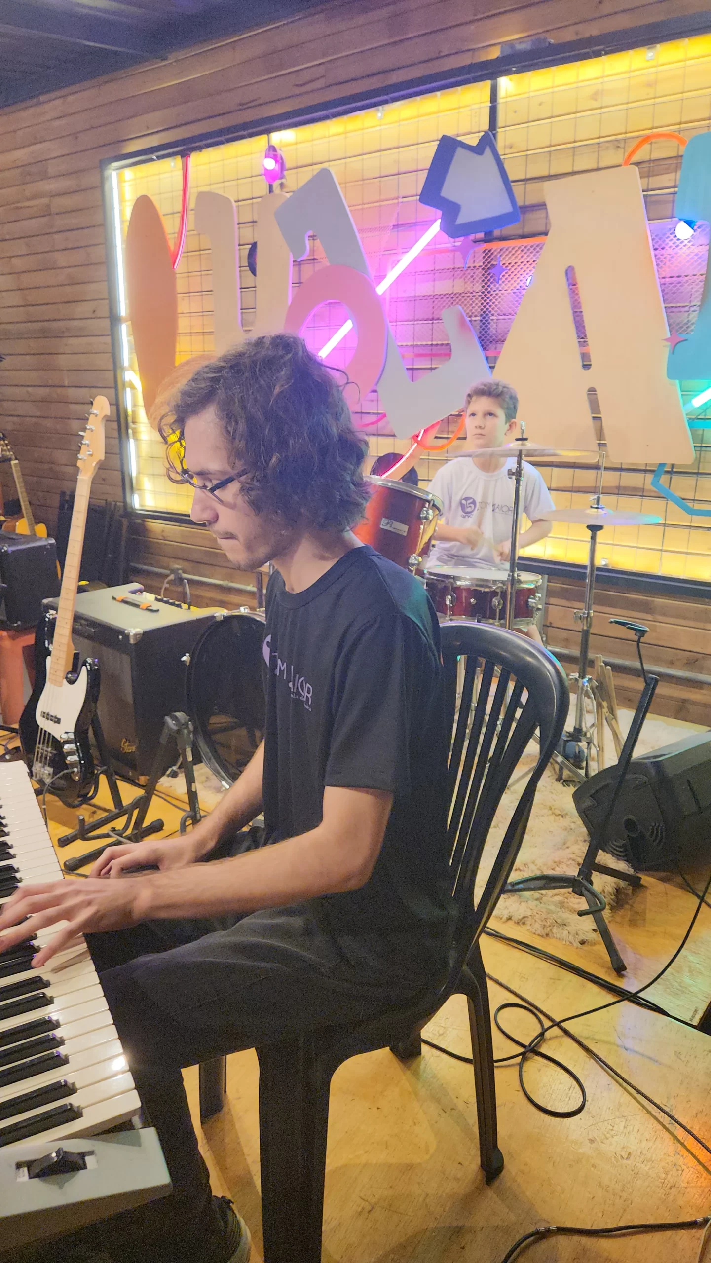 Também atende aos alunos de teoria musical, harmonia e improvisação em teclas.